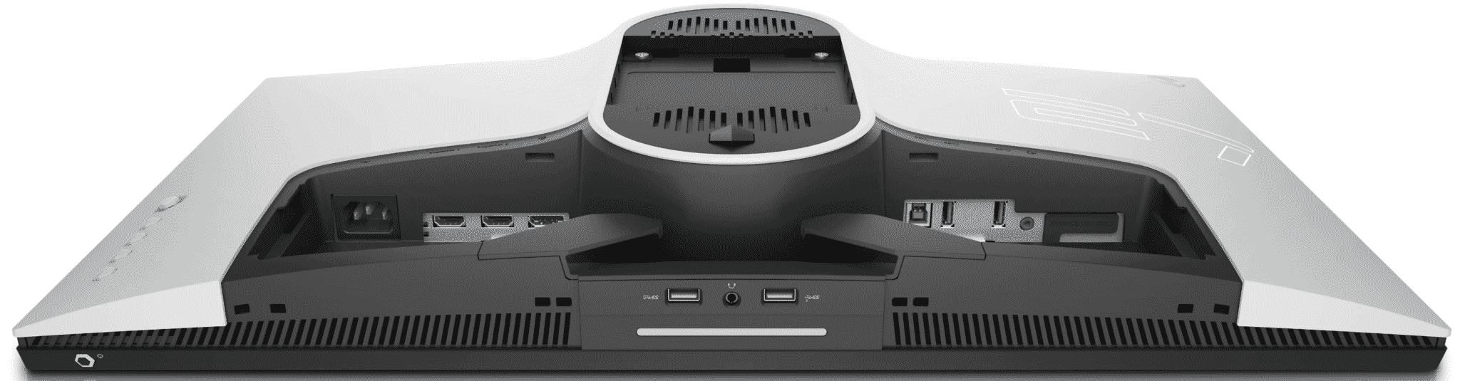 The concealed panel at the back includes DisplayPort 1.4, two HDMI 2.0 slots, and a total of five USB 3.2 Gen1 ports for convenience. Two of those USB slots are located in a hub under the bottom bezel, along with the headphone jack which is easier to reach. Take note that only the DP slot supports the full 240Hz refresh rate while the two HDMI slots can only do 144Hz.