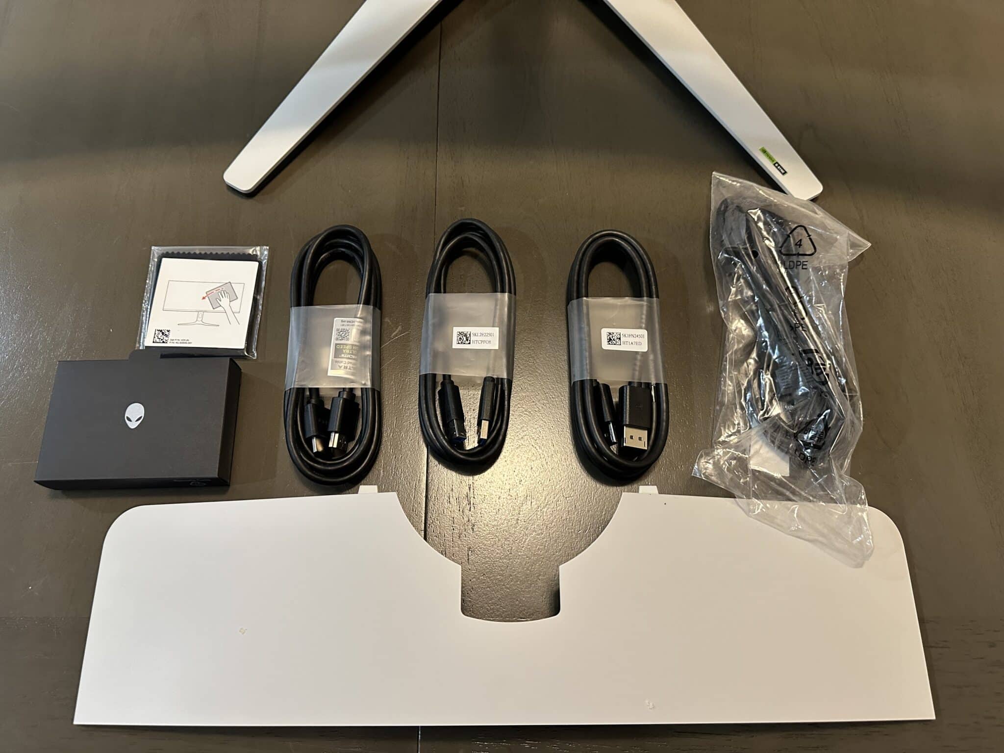 The box includes cables for power, DisplayPort, HDMI 2.1, and USB upstream. You also get a tiny Alienware box with stickers and documents, a cleaning cloth, a monitor stand, a calibration report, and a setup guide. It’s interesting to note that the HDMI 2.1 cable is marked as a high-bandwidth model that works great for 4K 120Hz, so we recommend using that for the PS5 or Xbox Series X instead of a cheapy one you can get at electronics stores.