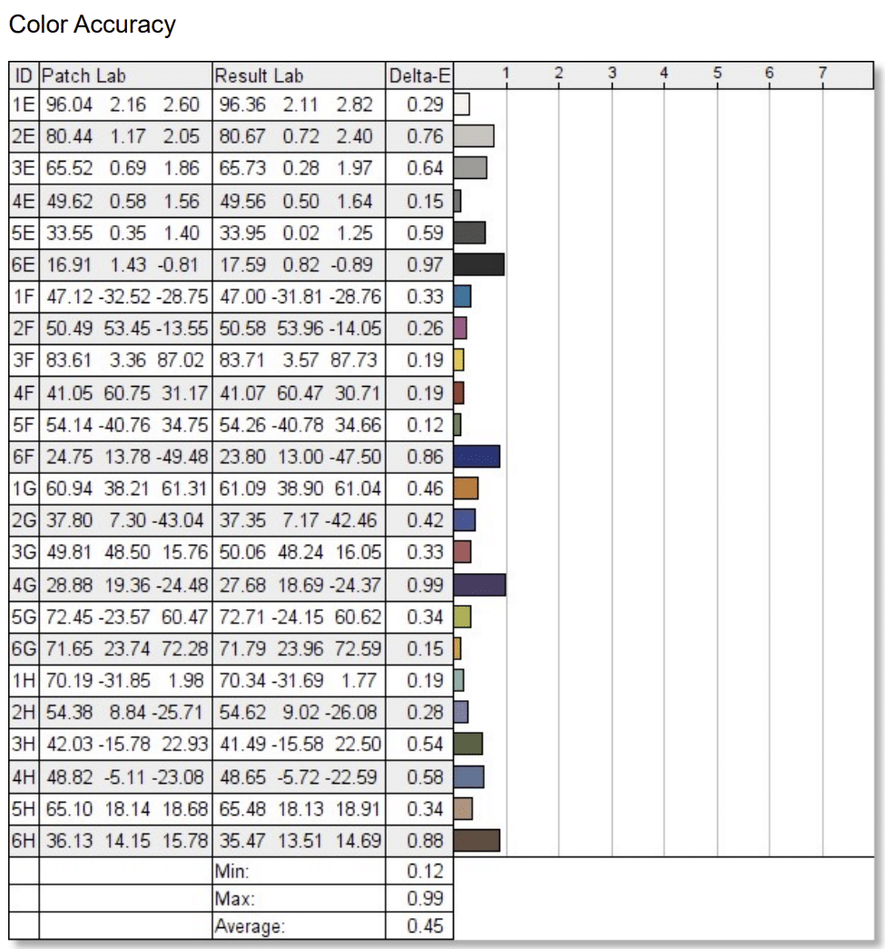 Calibrating it with our Calibrite Display Plus did not do much since the dE average went up to 0.9. However, almost every shade was under 0.5 except for blues, which had an error of 1.7 to 1.8, effectively raising the average. The bottom line here is that calibration isn’t necessary unless you want to maintain the panel’s fidelity for long-term use in color-critical work.
