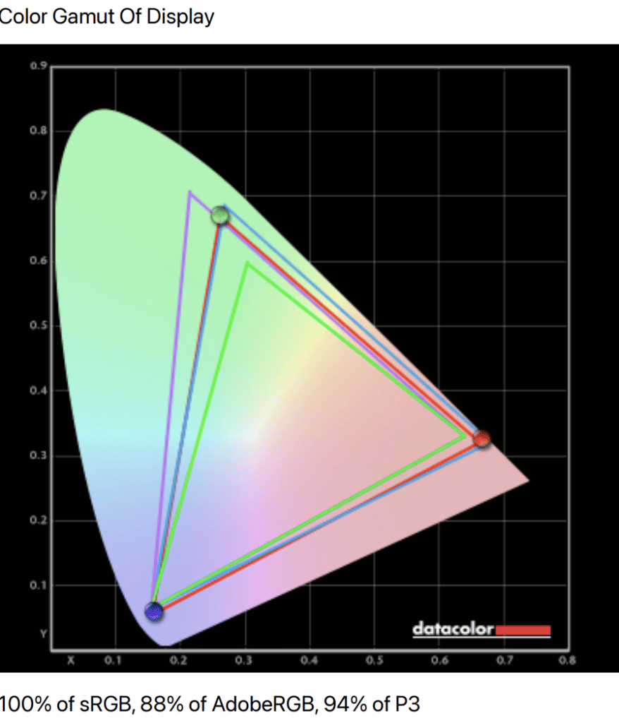 The BenQ Mobiuz EX480UZ covered 100% of the sRGB gamut and 94% of the DCI-P3 mode. However, its color accuracy using the default FPS mode was high with the deltaE average reaching 5.41. Using the DCI-P3 mode reduced that dE average to a more pleasing 1.89, so we recommend using that instead.