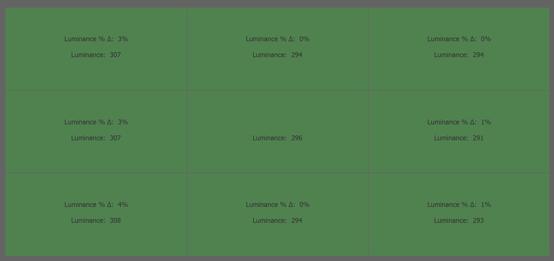 Panel uniformity for the test sample is excellent to the point that it makes us think that it was cherry-picked for this variant. The variance was between 1% to 4%, and most of them were on the left and right sides of the screen. Note that this can vary with every monitor made due to tolerances, so it is still possible to get a unit with defects like backlight bleeding.