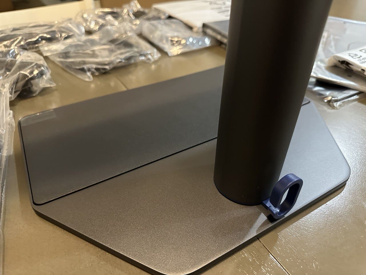 The included stand offers tilt, swivel, and height adjustments for your comfort and convenience. The movements are buttery smooth yet firm enough to prevent flexing and sagging. Its metal base is oversized, but it’s flat and thin. It has a leather-like pad on top that will cradle your gadgets and that sweet puck to keep them out of the way.