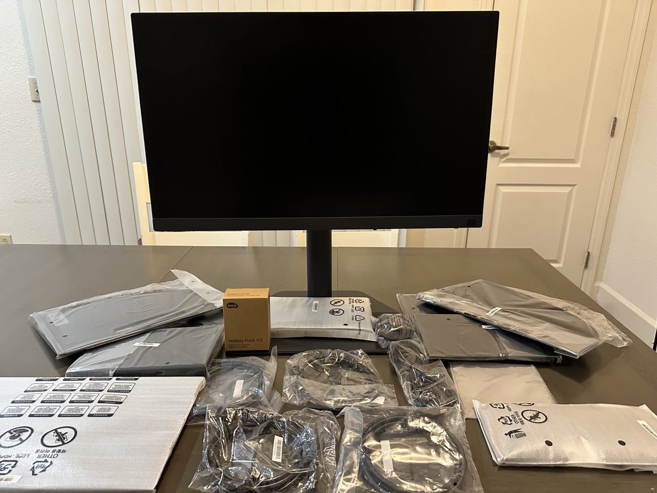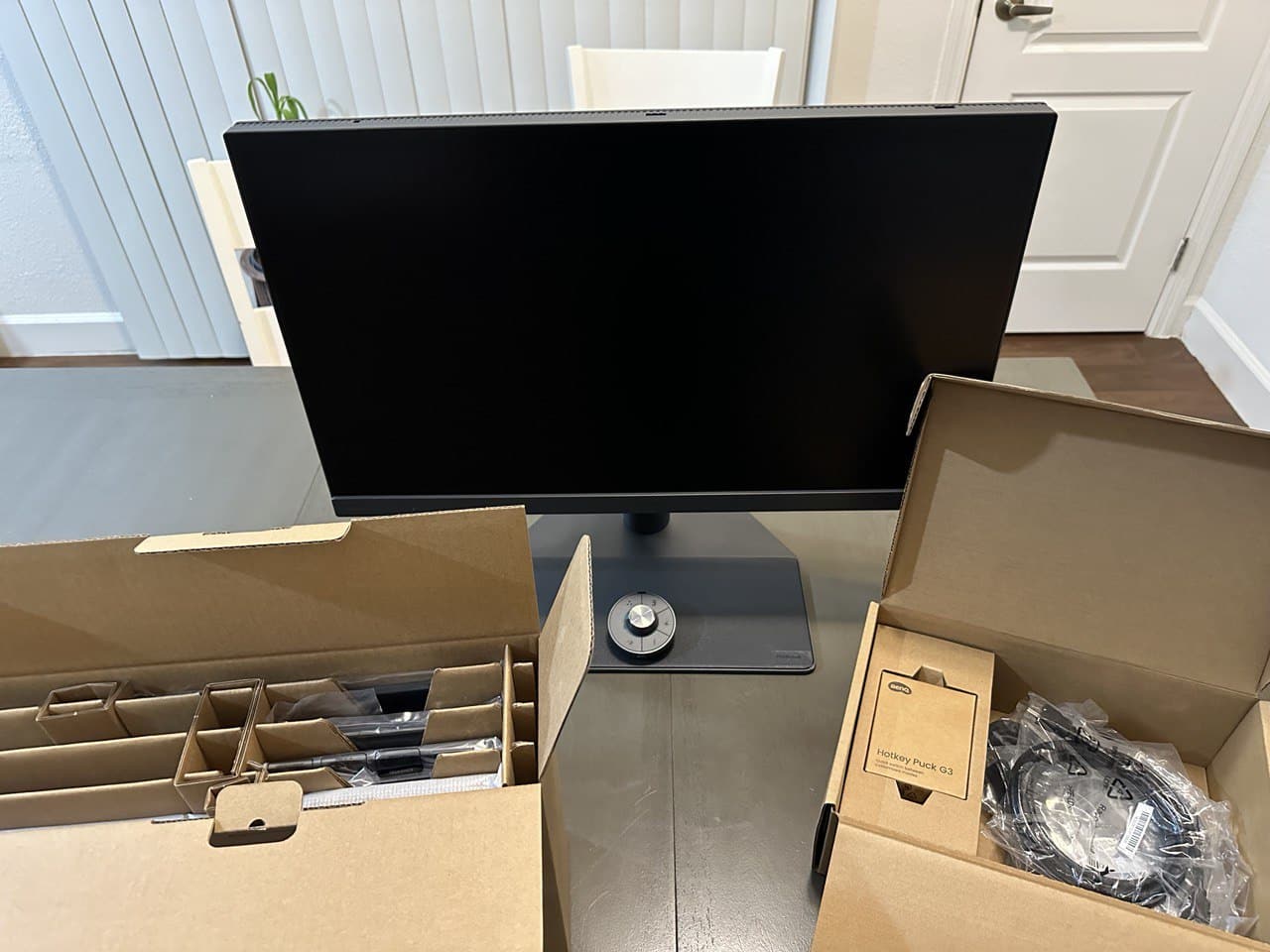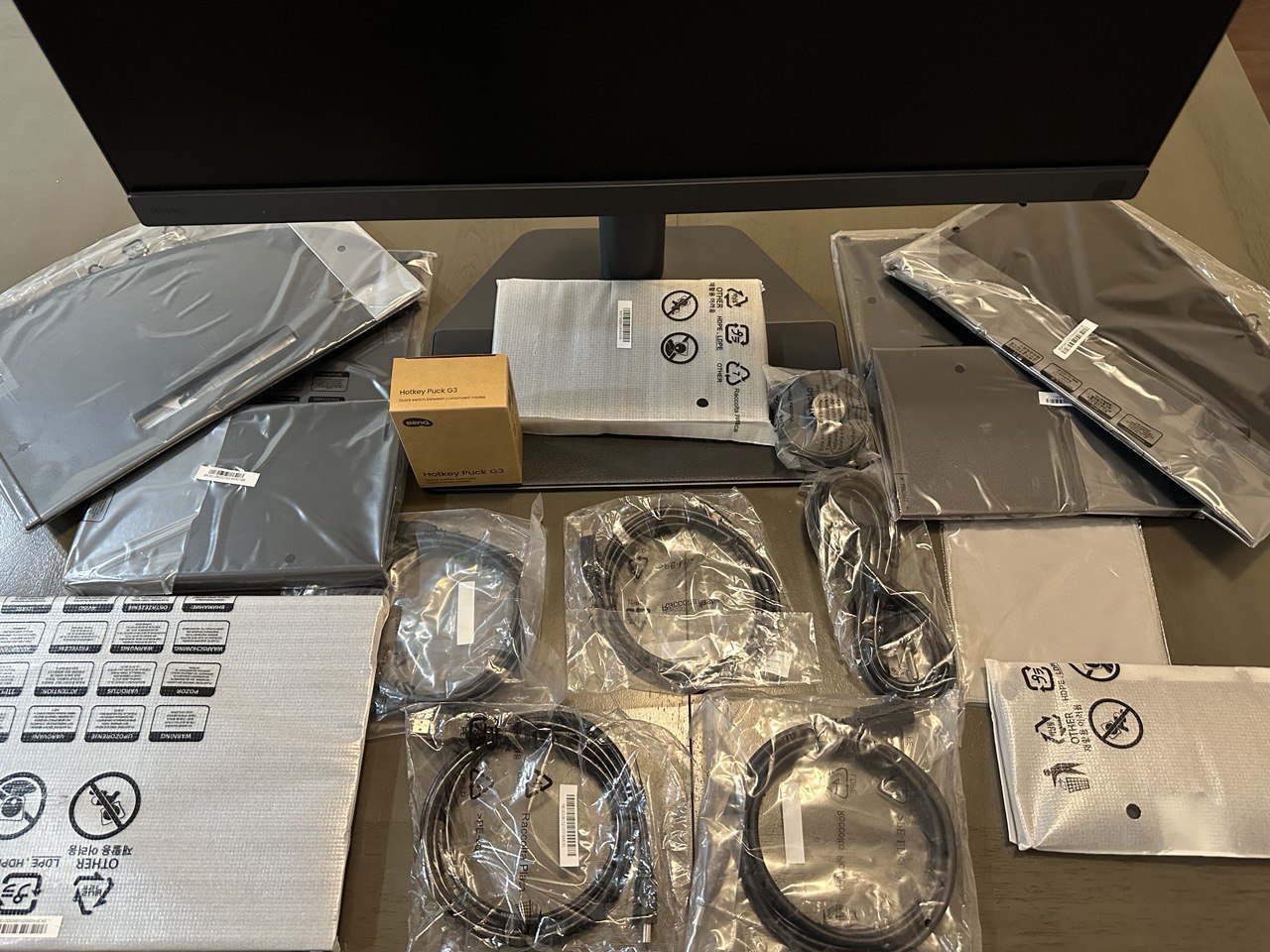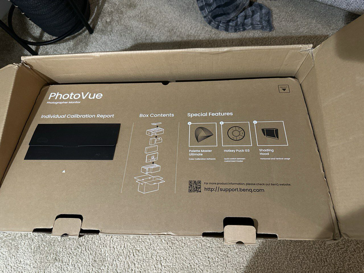 The monitor comes in three main pieces, but it has two accessory boxes and a calibration report neatly tucked into the primary flap of the box. The cables, cleaning cloth, and puck are in one box, while the larger carton holds the calibration hood. It may take a bit of time to get it up and running, but the first unboxing is always a joyous experience for any enthusiast.