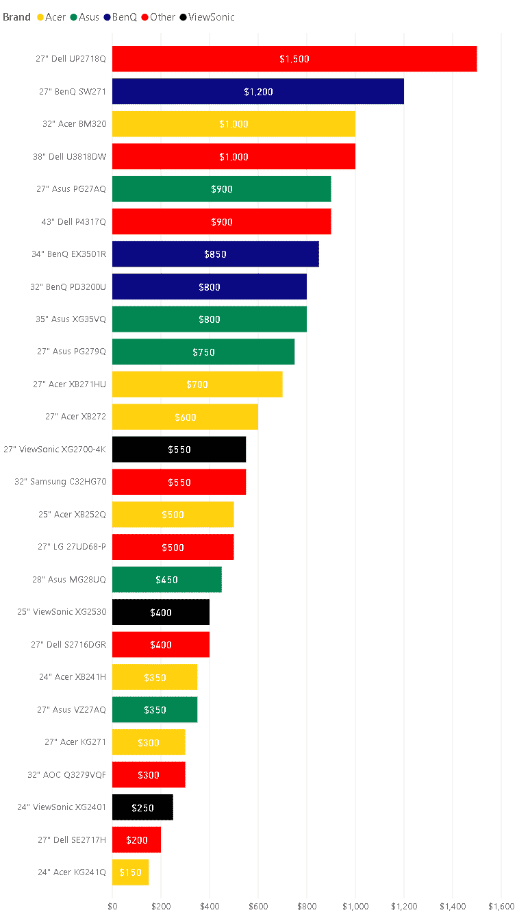 There are more factors than gaming monitor cost alone such as system specifications, but how much a person is willing to spend is still the critical factor. The graphic above represents the range or price bracket of the displays we have listed in our Monitor Selector Tool. The products can cost as low as $150 to as much as $1500, but we know it doesn’t stop there.