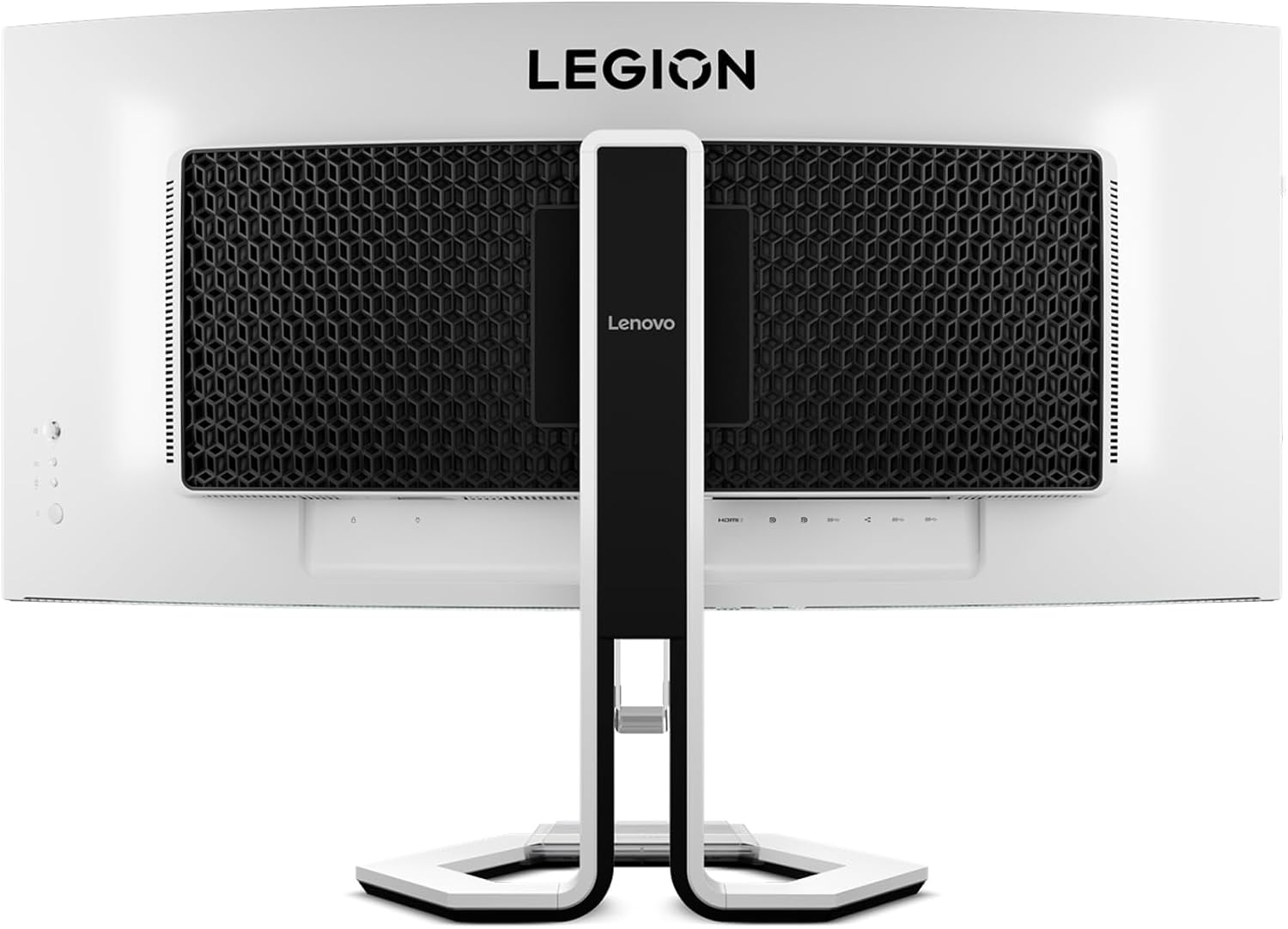 The Lenovo Legion Pro 34WD-10’s design is more aggressive this time, but it still looks clean and sophisticated. The monitor has a matte white chassis with a glossy black grill at the back and bottom, reminding us of a sports or luxury car front end instead of a gaming monitor. The screen doesn’t have bezels, but it still has inner borders like any regular monitor.