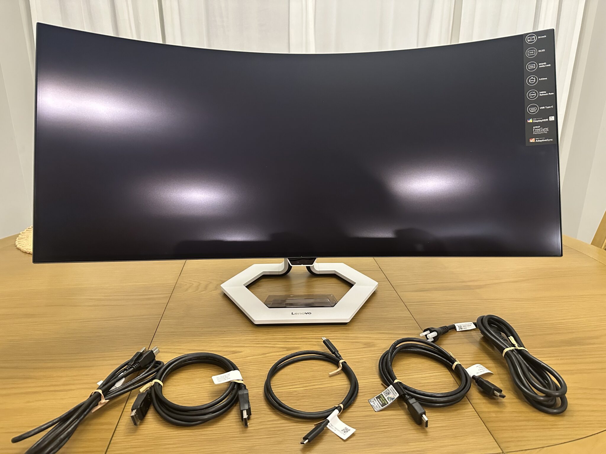 You also get everything you will need for the Lenovo Legion Pro 34WD-10’s functions with the package. You get cables for DP, HDMI, USB-C to USB-C, and a USB-B to USB-A wire for data upstream. You will also find documentation, including a calibration report for the device inside.