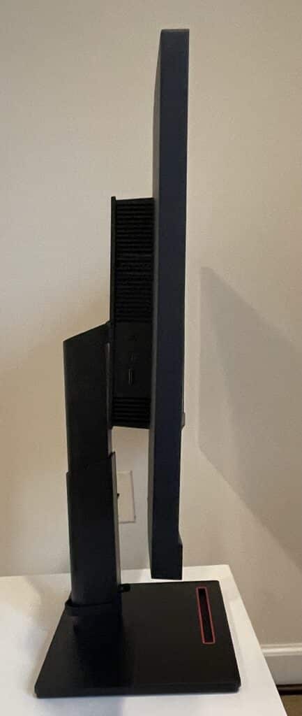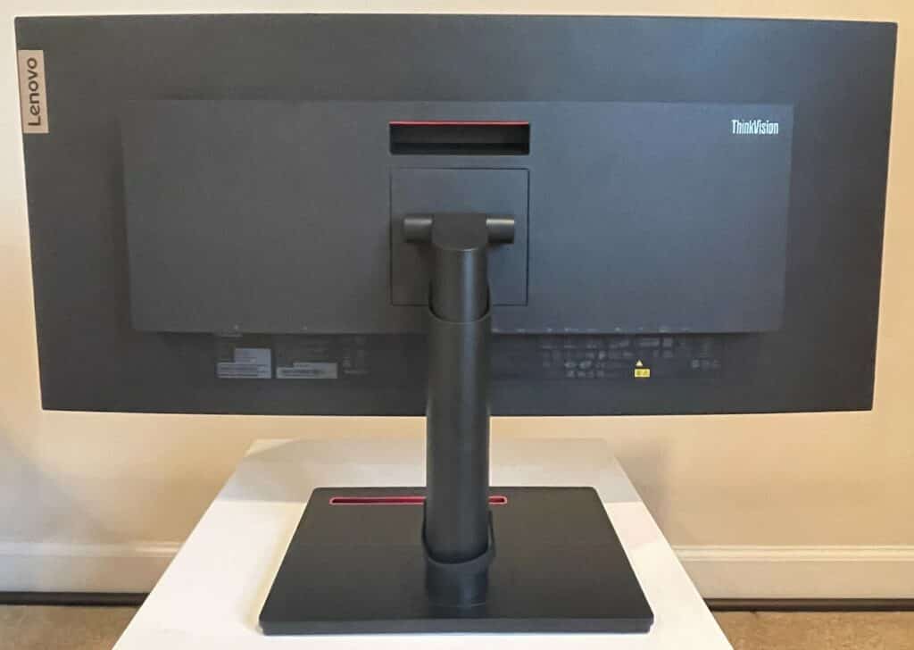 The Lenovo ThinkVision P34w-20 looks like most ThinkVision monitors so it looks sophisticated and business-oriented. The monitor has a matte black finish with subtle red accents on the base and at the back. The display is bezel-free on three sides, so there are fewer distractions while working or enjoying media.