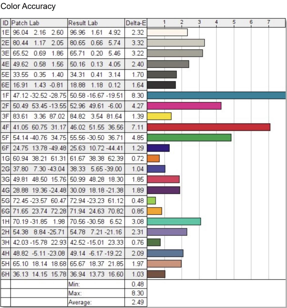 The Lepow Z1 covered a disappointing 63% of the sRGB gamut and 47% of DCI-P3. But on the other hand, its default accuracy is quite decent, with a deltaE average of only 2.43. The errors on the red and turquoise swatches are sizable, but the other shades are proper enough for daily use.
