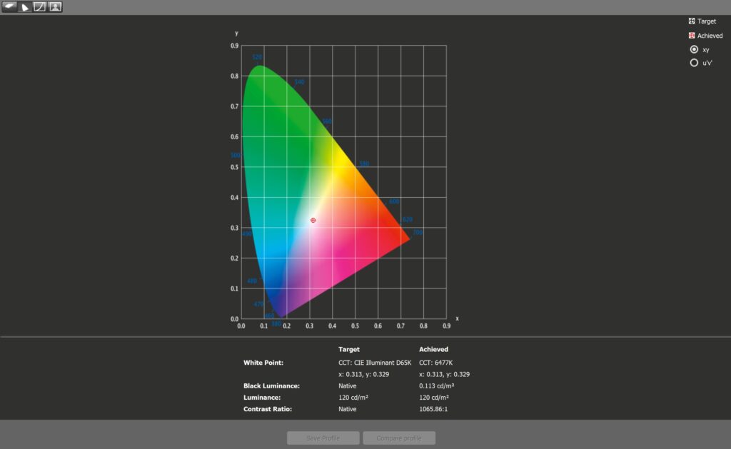 Its backlight mustered 223 cd/m2 at 100%, so it might struggle when used in an outdoor setting. Its impressive contrast reached 1065.58:1 at 70% brightness, resulting in a low black luminance of only 0.113. However, it’s still incapable of deep blacks like a VA alternative, but that’s an understandable limitation in this case.