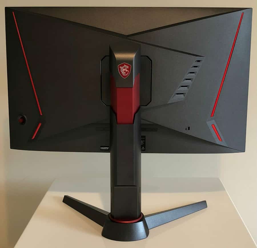 The rear of the MSI Optix MAG24C’s chassis has a hint of subtle aggressiveness with its clean, angular lines and red LED strips. The light is bright enough to provide bias lighting effects for users, although we wish that you could change the LED color to match different builds. At least MSI was thoughtful enough to add this finishing touch to a reasonably priced model, unlike with other brands where extras add a hefty premium.