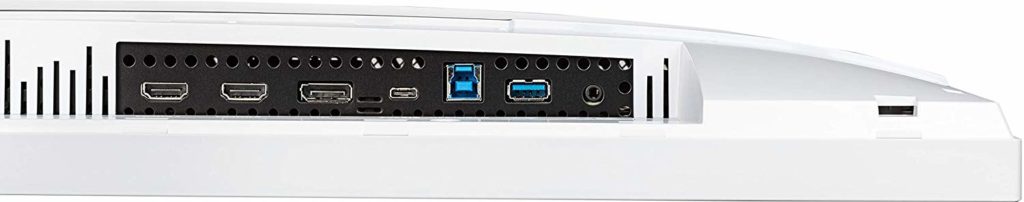 There is also a convenience hub on the side of the MSI PS341WU which includes two of the USB 3.2 ports and an SD card reader. Most would think the latter isn’t necessary, but many photographers will find this feature useful for hot-swapping memory cards from their cameras. You will also find two 3.5mm jacks for audio input and output on this side which makes connecting your headphones or mic easier.