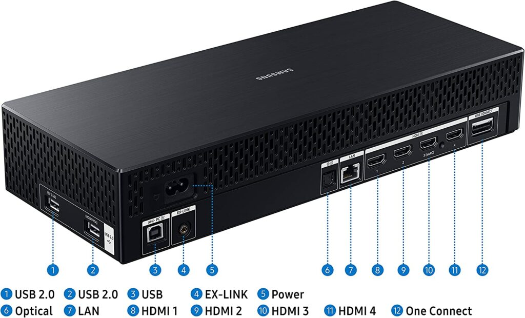 Another unique design we liked on the Samsung Odyssey Ark is its One Connect Box which houses all its ports. The Ark has four HDMI 2.1 ports, an RJ45 LAN slot, digital and analog audio ports, plus two USB 2.0 ports for accessories. It is great for cable management since you can get them out of the way, plus it also guarantees that you won’t pull a line out when turning the screen into its cockpit mode.