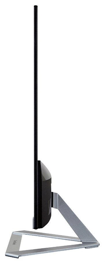 The cabinet is clad in matte black with silver accents on the bottom strip and the stand, but one of the characteristics we immediately notice is how slim this model is in person. From the side, the cabinet is only a few millimeters thin while the bulge doesn’t go over three inches. The triangular stand takes up a little over 8 inches on your desk, making the whole package compact as a 27-incher.